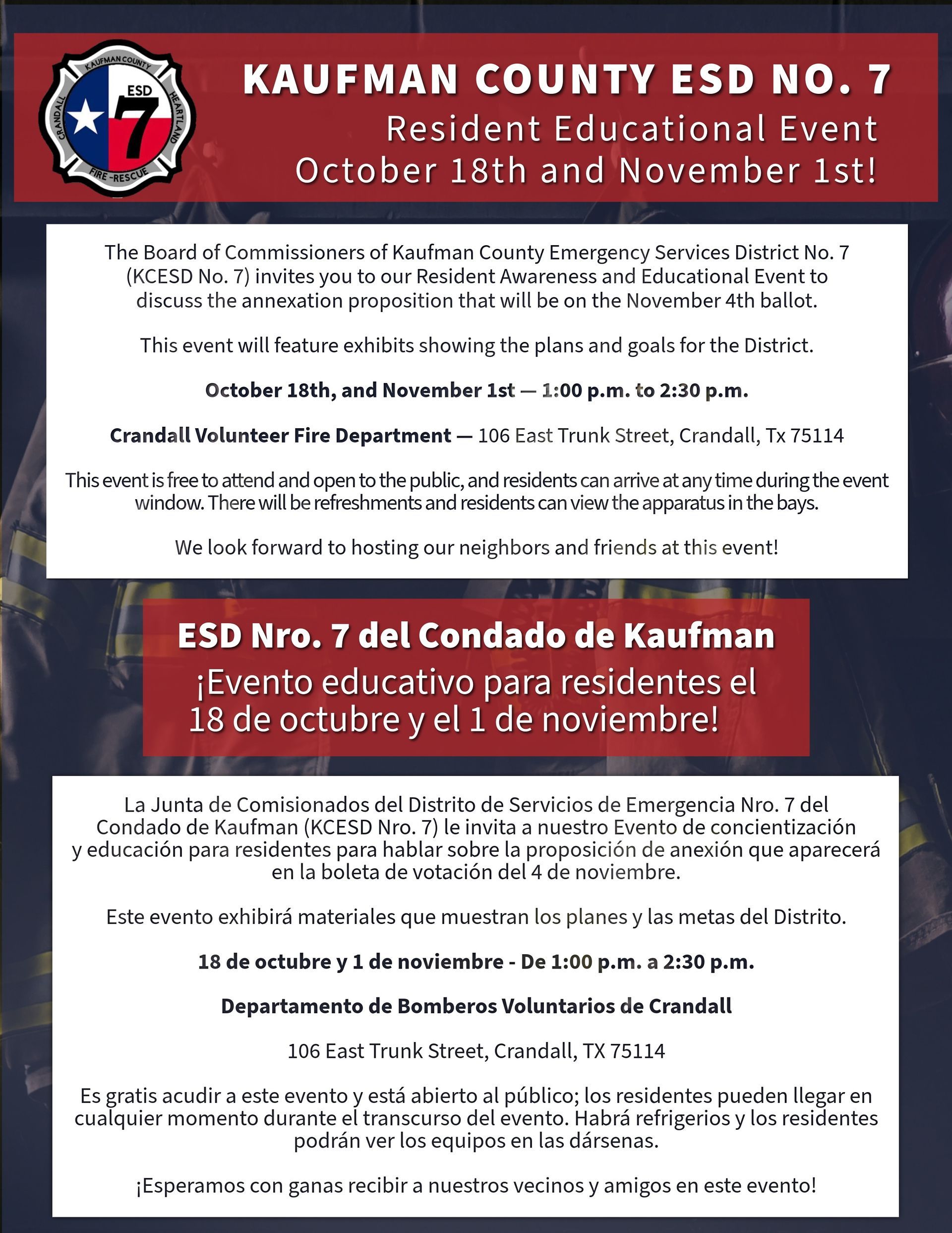 An Emergency Services District (ESD) is a local government agency created by a vote of the public to provide fire protection and/or emergency medical services (EMS) in specific areas in unincorporated Kaufman County. There are more than 310 ESDs in Texas, 7 of which are in Kaufman County. The governing statute for an ESD is Chapter 775 of the Texas Health and Safety Code. An ESD collects taxes based on appraisals of real and personal property and usually contracts with a service provider (e.g. Crandall Fire Department).