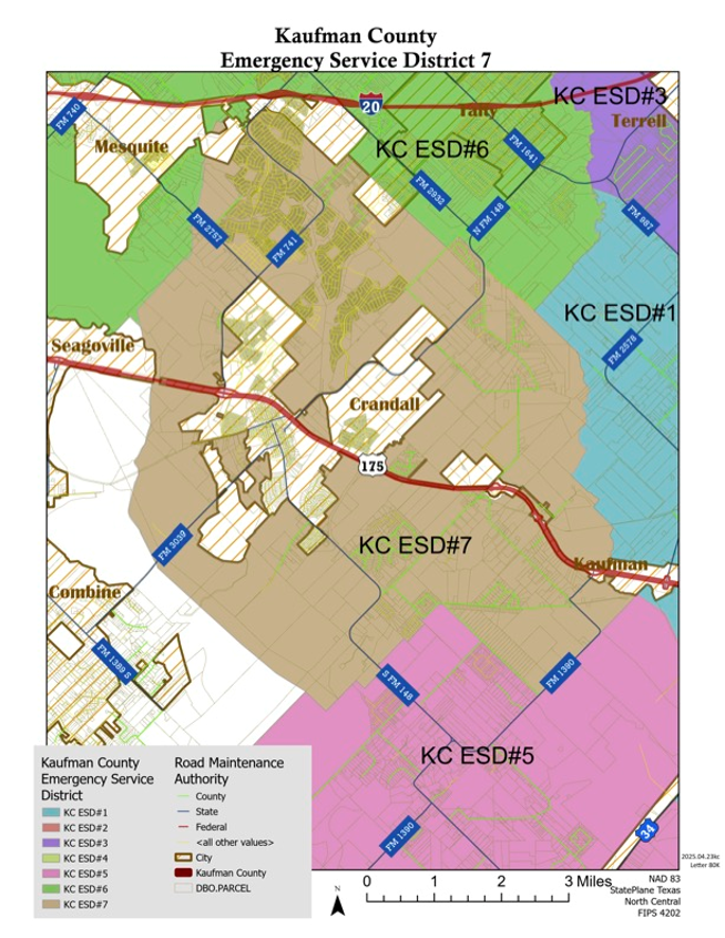 The Board of Commissioners (the "Board") of Kaufman County Emergency Services District No. 7 (“KCESD 7”, or the "District") has called for an annexation proposition to be placed on the ballot for the November 4, 2025 Election. If approved by voters, this proposition would authorize the District to add all area within the city limits of the city of Crandall to the District’s boundaries. The city of Crandall is currently being serviced by the Crandall Volunteer Fire Department which is primarily funded through KCESD 7 for both fire protection and emergency medical services via contract.